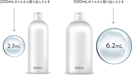 ボトルの容量による使用量の違いを調べると、細長い200mLのボトルから取り出した場合は平均2.3mL、500mLでは平均6.2mLという結果に。大容量ボトルのほうが、惜しみなくじゃぶじゃぶ使ってもらえることが分かりました。